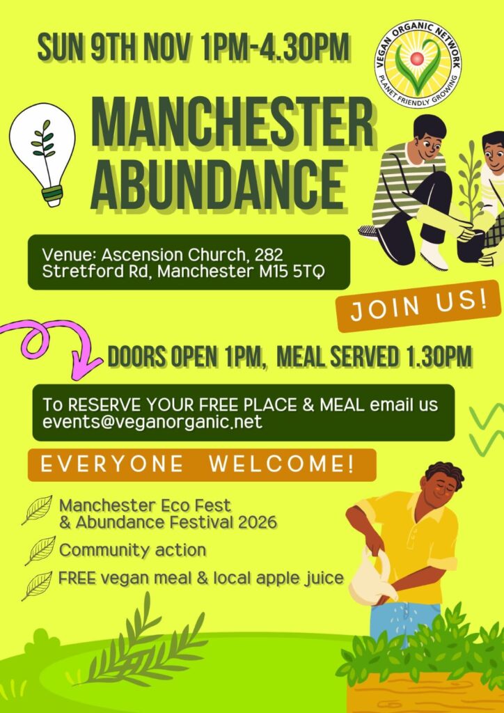 Free vegan meal and juice: 1.30pm – please book so we know how much food to make – events@veganorganic.net