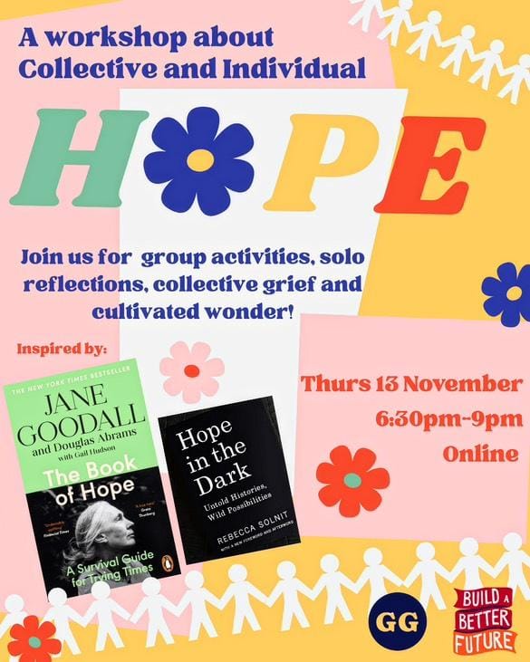 Join us for group activities, solo reflections, collective grief and cultivated wonder. In this workshop we approach hope as a skill that we can practice and improve.